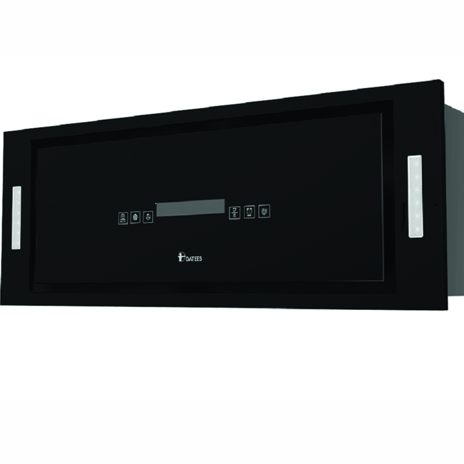 هود مخفی داتیس با قدرت مکش 700 تا 900 CFM، هود سوپر سایلنت با موتور فلزی 6 دور. دارای ترموگارد ایمنی و دو عدد حسگر بو، گاز و حرارت. دارای سنسور اشاره دست، جک برقی و ریموت کنترل. نمای بیرونی شیشه و ساعت دیجیتال با بدنه استیل رنگ استاتیک مشکی.