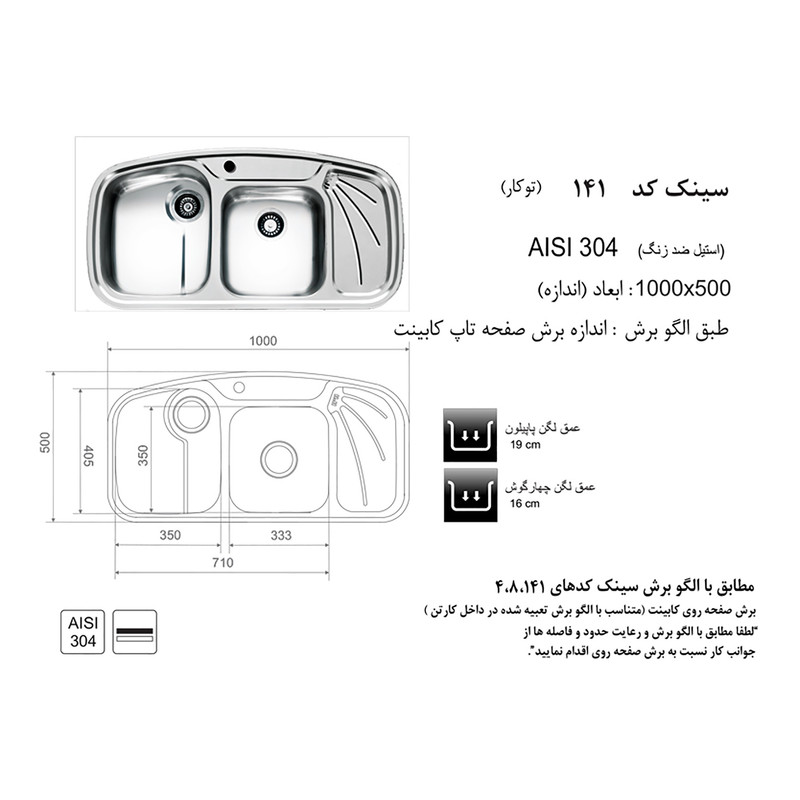 دستهبندی: سینکنحوه نصب: توکارجنس سینک: استیلتعداد لگن: دوعمق لگن: 180 میلیمترنوع سیفون : معمولیابعاد سینک : 500 × 1000 میلیمترنمایش بیشتر