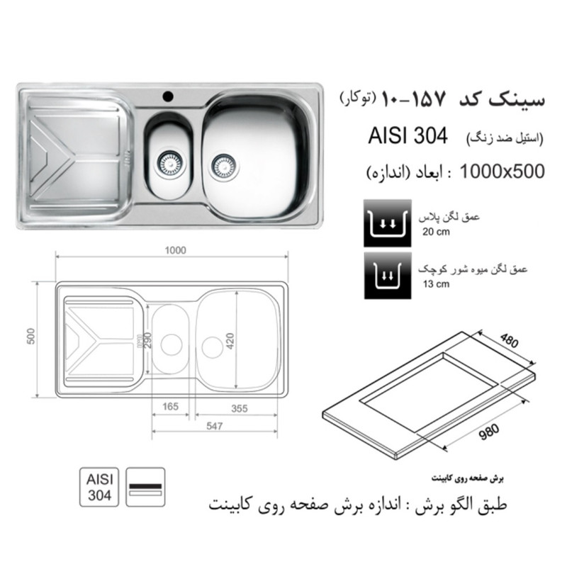 ابعاد سینک: 500 × 1000 میلیمتر