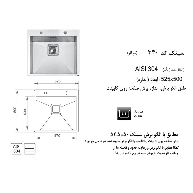 ابعاد سینک500 × 500 میلیمترنحوه نصبتوکارجنس سینکاستیلتعداد لگنیکعمق لگن200 میلیمترنوع طراحی سینکفانتزینوع سیفونمعمولیسایزلگن سمت چپ