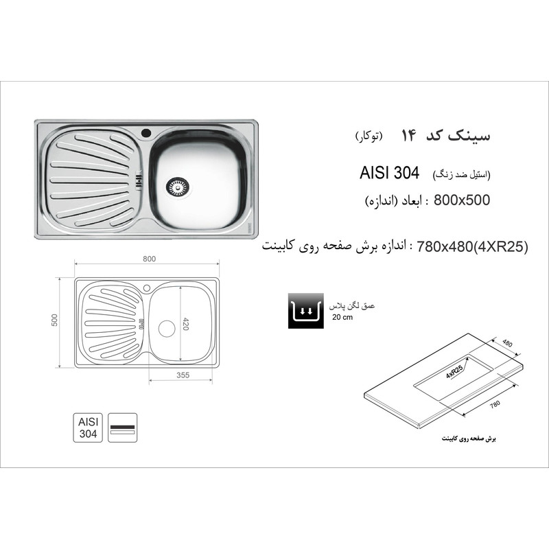 ابعاد سینک800 × 500 میلیمترنحوه نصبتوکارامکاناتدارای سینیجنس سینکاستیلتعداد لگنیکعمق لگن180 میلیمترنوع طراحی سینکفانتزینوع سیفونمعمولیسایر توضیحاتدارای یک عدد سینی پلاستیکیسایزلگن سمت چپ