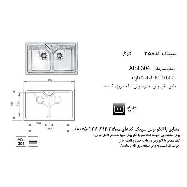 ضخامت ورق استفاده شده : استیل با ضخامت بالا ، یک میلیمتری - نوع اتصال سینک به کابینت : بست فلزی - نوع زیراب استفاده شده : دایره ای با تخلیه سریع- نوع طراحی لگن : طراحی لگن ها R25 ( محبوب ترین طرح لگن )