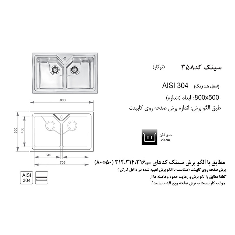 ضخامت ورق استفاده شده : استیل با ضخامت بالا ، یک میلیمتری - نوع اتصال سینک به کابینت : بست فلزی - نوع زیراب استفاده شده : دایره ای با تخلیه سریع- نوع طراحی لگن : طراحی لگن ها R25 ( محبوب ترین طرح لگن )