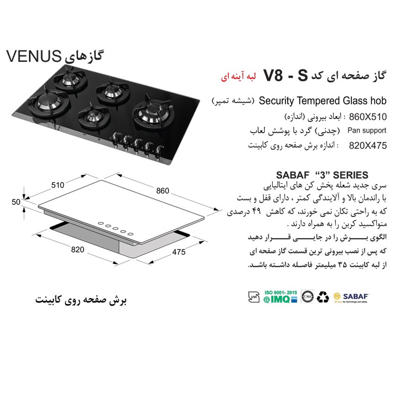 چدنی های گاز اخوان V8S به صورت گرد و با پوشش لعاب می باشند و اندازه بیرونی این اجاق گاز 86 در 51 سانتی متر میباشد . همچنین اندازه برش روی صفحه کابینت نیز 820 در 475 میلی متر می باشد.