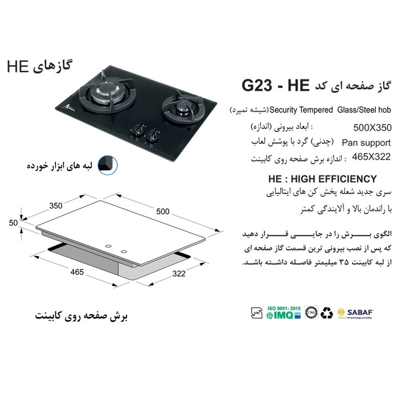 گاز صفحه ای اخوان مدل G-23-HE پرفروشترین گاز 2 شعله استیل است. این اجاق گاز با شیشه مشکی، قطعات ایتالیایی و ولوم های نسوز مقاوم در برابر حرارت تولید شده است. طول گاز 50 سانتیمتر و عرض آن 35 سانتیمتر است. این گاز دارای یکی شعله بزرگ و یک شعله کوچک می باشد و در تولید آن از شیشه سکوریت تمپر استفاده شده است . شیشه این گاز دو شعله اخوان لبه ابزار خورده می باشد که زیبایی خاصی به آن بخشیده است و قابلیت نصب روی کابینت عرض 50 را نیز دارد. این محصول از سری گاز های HE شرکت اخوان می باشد که دارای سری جدید شعله پخش کن های ایتالیایی و با راندمان بالا و آلایندگی کمتر می باشند . نکته جالب در خصوص این اجاق گاز دو شعله شیشه ای دارا بودن VOK می باشد .
